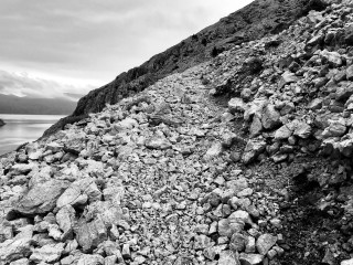 Stižemo na plažu, zbog napetosti u stopalima, skidam obuću i do gležnja ulazim u more. Računam da ću temperaturnim šokovima hladnog mora i donekle toplih kamenčića na plaži, potaknuti jaču cirkulaciju i brže se oporaviti radi lakšeg uspona koji slijedi za sat vremena.
