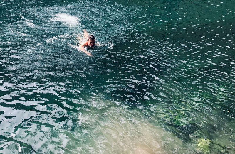 Skidam se i ulazim u plićak. Kažu da ispod 10°C osjetiš laganu bol zbog hladnoće pa zaključujem izostankom tog osjećaja da je temperatura oko 15-17°C.