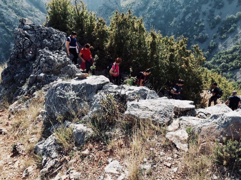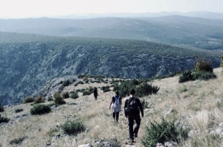 Nakon kratkog hoda, stajem i hvatam se za drvo. Osjećam lagani grč u mišiću iznad koljena. Istežem se par sekundi i nastavljam. Ponavljam istezanje nakon stotinjak metara. Bolje je. Teren postaje sve strmiji. Na jednom kratkom dijelu postavljena je sajla pa se penjemo jedan po jedan. Povremeno se okrećemo i gledamo to ličko prostranstvo okruženo planinama. Sežu pogledi na Sveto brdo, Vaganski vrh, autocestu, tunel Sveti Rok...